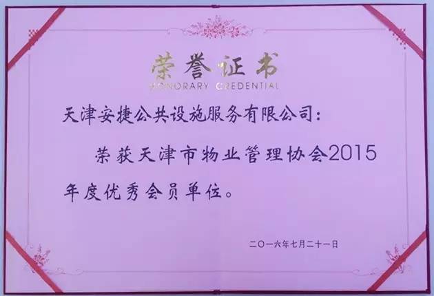 安捷榮獲天津市物業(yè)管理協(xié)會2015年度優(yōu)秀會員單位稱號