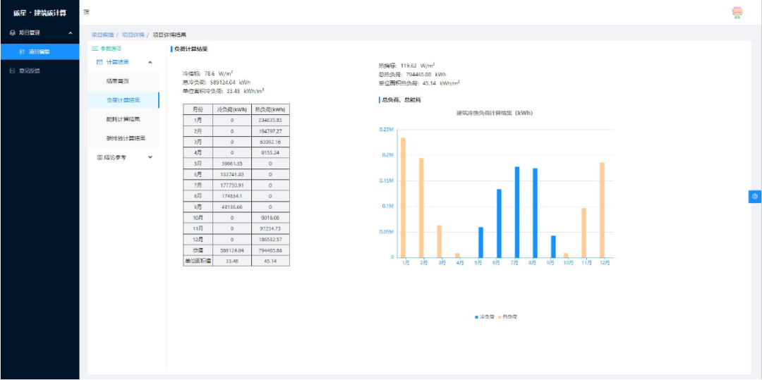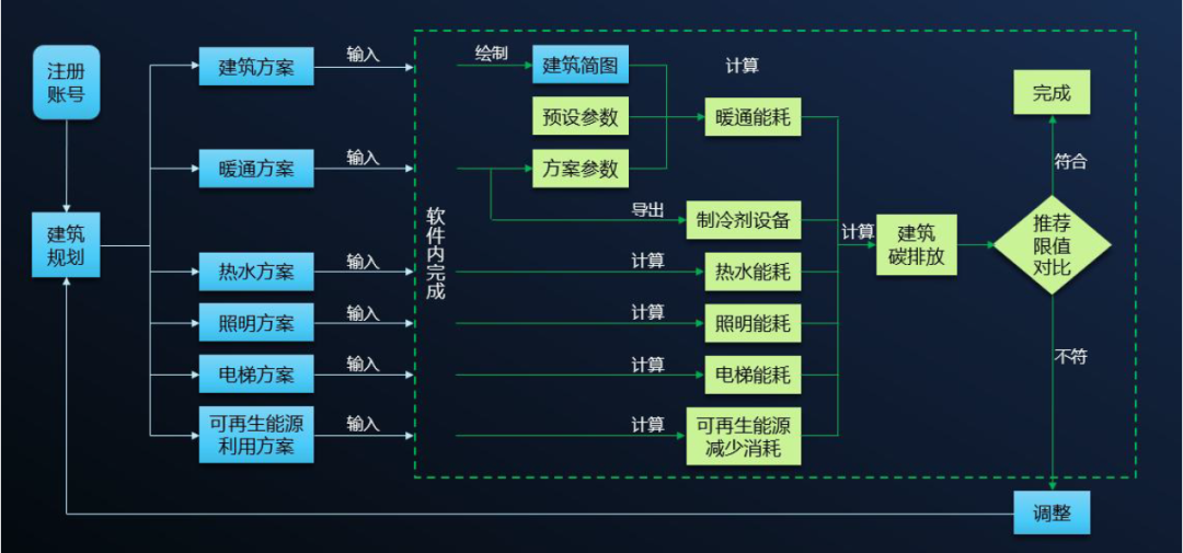 用戶在軟件中輸入建筑方案、暖通方案、熱水方案、照明方案、電梯方案和可再生能源利用方案,軟件會計算得出各個系統(tǒng)能耗值,再根據碳排放因子庫,計算得出建筑碳排放量,并將計算結果做圖形化展示和導出,使用戶能夠在建筑規(guī)劃階段預估建筑能耗和碳排放。