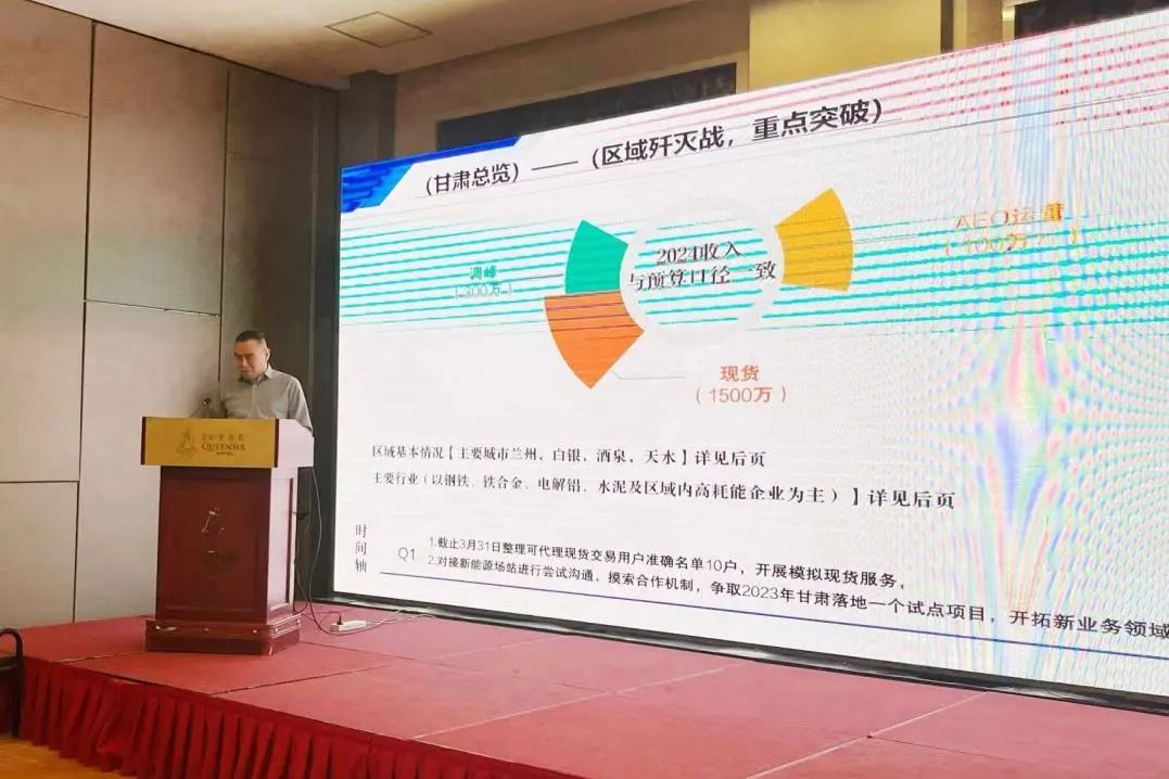 新疆公司總經(jīng)理兼AEO西北事業(yè)部經(jīng)理黃卿對部門2023年度工作的經(jīng)營數(shù)據(jù)、運營工作及相關(guān)問題進行總結(jié),對陜西售電業(yè)務(wù)及西北調(diào)峰業(yè)務(wù)的經(jīng)營數(shù)據(jù)進行了分析。黃卿分析了部門運營過程中暴露的問題,反思和并提出了相關(guān)問題的解決措施的。關(guān)于2024年的工作計劃,將進一步明確部門職責流程,部門SOP;發(fā)展低碳業(yè)務(wù)推動西北公司綠證交易、碳交易托管、碳質(zhì)押等業(yè)務(wù),此外在部門內(nèi)部建設(shè)新能源交易托管的專業(yè)能力,打通商業(yè)模式。同時加快完善渠道商管理機制的建立,以及新疆市場的規(guī)劃工作。