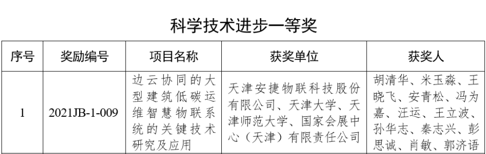 日前,2021年天津市科學(xué)技術(shù)獎獲獎名單公布,由天津安捷物聯(lián)科技股份有限公司聯(lián)合天津大學(xué)、天津師范大學(xué)、國家會展中心(天津)有限責(zé)任公司申報(bào)的《邊云協(xié)同的大型建筑低碳運(yùn)維智慧物聯(lián)系統(tǒng)的關(guān)鍵技術(shù)研究及應(yīng)用》項(xiàng)目,榮獲“天津市科學(xué)技術(shù)進(jìn)步一等獎”。
